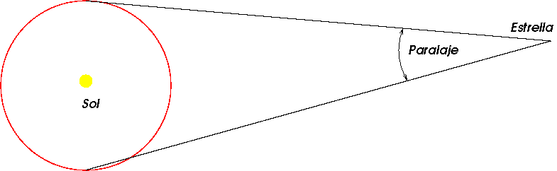 Indice Introducción Medidas por Eco (Definición de la Unidad Astronómica) Medidas por Paralaje (Definiciónde del Parsec) Medidas por Estrellas Variables Distancias Cosmológicas Teoría Atómica Efecto Doppler Introducción La astronomía es una ciencia de dos dimensiones. A excepción de la Luna , y el Sol, el resto de los objetos nos parecen puntos a una distancia infinita y los colocamos sobre una bóveda a distancia desconocida. Durante siglos la única preocupación era saber la posición del cuerpo celeste sobre esa bóveda que queda definida por dos números, llamados coordenadas celestes, cuya expresión actual son las las coordenadas ecuatoriales. Durante siglos lucharon los astrónomos por ponderar la distancia hasta aquella bóveda y solo recientemente, cuando se comenzó a construir telescopios, se ha podido determinar con alguna precisión. Por supuesto que ya no hablamos de bóveda, los cuerpos se distribuyen a diferentes distancias, y lo que nos parece una figura (por ejemplo las constelaciones) no es más que un efecto de la proyección. Determinar distancias cuando no podemos ir hasta el objeto es realmente una tarea difícil que nos obliga a usar todo nuestro ingenio, echando mano de teorías y modelos, haciendo hipótesis y arriesgando conclusiones. En algunos casos sólo podemos determinar valores muy aproximados, en otros, los debates entre diferentes investigadores se extienden por décadas. A continuación, una lista de diferentes maneras para medir distancias astronómicas junto con la definición de algunas unidades de medida muy usadas en astronomía. Medidas por Ecos Enviar una señal sobre el objeto cuya distancia deseamos medir, esperar que la misma rebote (eco) y medir el tiempo que demoró en ir y volver es una forma muy precisa de medir distancias. La señal puede ser una onda de radio (o sea que estaremos usando un RADAR) o luz. La ventaja de las ondas de radio es que no precisan de una superficie muy lisa para producir un reflejo bueno y que poseemos receptores que son capaces de detectar señales muy débiles. Con sistemas de este tipo la distancia de la Tierra a Venus fue determinada con la precisión de 1 km y a partir de ella inferimos la distancia al Sol DST: para eso precisamos conocer la mayor y menor distancias al planeta, y aplicar la fórmula siguiente donde a es la mayor distancia y b la menor distancia a Venus. La figura siguiente ayuda a entender el porqué de esta definición. ![]() (Ref.: Encyclopedia of Astronomy & Astrophysics, Nature Pu., 2001) Normalmente redondeamos este número a UA ~ 1,5 x 1011 m (si es necesario pueden leer una explicación de la notación científica.) Una luz láser es otra alternativa para obtener un eco, porque tiene una mayor coherencia que la luz normal lo que hace que no se difunda demasiado, permitiendo que una proporción razonable de la luz emitida vuelva al laboratorio. Sin embargo un láser precisa de un espejo de buena calidad para reflejarse. Por eso hubo que esperar a que los astronautas fueran a la Luna y depositaran el Laser Ranging Retro-Reflector (LR-3, Retroreflector para medir Distancias con Láser). Con este espejo y pulsos lásers enviados desde la Tierra se pudo medir con gran precisión la distancia hasta la Luna, y hacer hasta selenosismología. Paralaje El método del eco sirve para medir distancias muy cortas, distancias mayores exigen métodos diferentes. Uno de ellos es el método del paralaje. Llamamos paralaje a la diferencia angular producida cuando observamos un mismo objeto desde diferentes posiciones. La figura de abajo muestra la idea. El círculo rojo representa la órbita de la Tierra, desde posiciones diametralmente opuestas observamos un mismo objeto, el paralaje es el ángulo subtendido por las líneas de observación en las dos diferentes posiciones. ![]() A partir del método de paralaje, se creó una unidad de medida astronómica. Cuando el paralaje es igual a 2 segundos de arco, la distancia del objeto es 1 parsec, cuyo símbolo es pc, incluyendo múltiplos como kpc o Mpc. Un parsec corresponde, aproximadamente a 3,262 años luz. Los astrónomos prefieren al pc porque relaciona separación angular con distancia. Generalmente se da la definición en función de 1 UA y no de 2. En otras palabras, a 1 pc de distancia, una separación angular de 1" corresponde a una distancia espacial de 1 UA. Y además podemos usar una fórmula simple: donde d es la distancia al cuerpo celeste en pc y π es el paralaje en segundos de arco. Esta aproximación es suficientemente precisa cuando tratamos con objetos distantes. Además en este caso debemos medir el paralaje en una base de 1 UA (ese es el sentido del número 1 en el numerador de la fórmula). El uso de paralajes permite una medición directa y precisa de las distancias. Lamentablemente queda limitado a la vecindad solar. Medir ángulos de segundos de arco es tarea para telescopios buenos, pero eso sólo nos permite determinar distancias de hasta 1 pc o 3,262 años luz. Telescopios muy buenos consiguen medir paralajes de décimos y, tal vez, centésimos de segundo de arco. Pero con estas medidas, conseguimos inferir distancias de hasta 10 o 100 pc claramente insuficiente si recordamos que la Vía Láctea tiene un tamaño de decenas de miles de pc. Estrellas Variables El brillo de algunas estrellas varía a lo largo del tiempo, a veces de forma periódica. A fines del siglo XIX, la astrónoma Henrietta Leavitt, trabajando para el observatorio de Harvard, descubrió la relación cualitativa entre el brillo intrínseco de las estrellas del tipo δ Cephei, o simplemente cefeidas y su período de variación. El descubrimiento de Leavitt no pasó dessapercibido y rápidamente fue utilizado para descubrir distancias a las galaxias, previamente hubo que calibrarlo. Edwin Hubble, por ejemplo, usó cefeidas para demostrar fehacientemente que las nebulosas espirales eran objetos fuera de la Vía Láctea y posteriormente para encontrar l