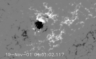 | Sucesión de manchas pasando sobre la superificie del Sol. Puede