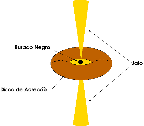 A massa do buraco negro central de alguns quasares é da ordem de 109 M⊙ (massas solares), isto é, não muito diferente da massa de toda a Via Láctea, que por sua vez tem um modesto buraco negro de pouco mais de 106 M⊙. Na verdade a Via Láctea está longe de ter características de AGN. Uma visão geral esquemática deste tipo particular de galáxias pode ser visto na figura abaixo. Hoje existe a idéia de que os AGN são objetos com as mesmas características, mudando apenas a orientação relativa a nós. Por exemplo, se o jato está apontando para a Terra, ou se vemos o disco de acreção de lado.