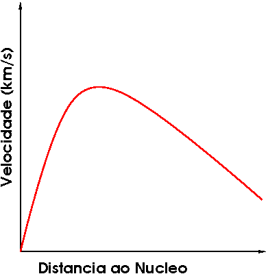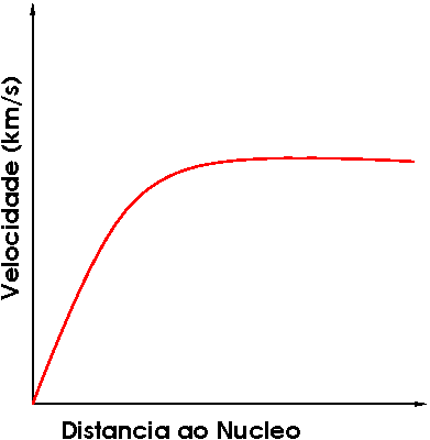 Distribuição da matéria Agora que conhecemos os elementos de uma galáxia, nós queremos saber como eles são distribuídos. As galáxias são tipicamente formadas por três regiões distintas: 1 Núcleo 2 Disco 3 Halo O Núcleo é a parte central de toda galáxia. Tem uma forma aproximadamente esférica e uma extensão de 10 a 20% do ráio da galáxia. Em geral é de cor avermelhada, indicando que está populado por gigantes vermelhas, estrelas velhas, também chamadas de População II pelo astrônomo alemão Walter Baade. Uma grande quantidade de poeira a torna mais vermelha ainda, ao absorver a luz azul e reemiti-la em frequências mais baixas. Estas nuvens de poeira impedem também que possamos ver com clareza o centro. Para podermos nos aproximar, devemos usar ondas de maior comprimento, por exemplo, infra vermelho, ou rádio. Técnicas rádio-astronômicas como Interferometria de Muito Longa Base (VLBI em inglês) e telescópios em órbita como o Spitzer ou o Herschel estão ajudando a conhecer estas regões escuras. Em torno do núcleo está o Disco, que pode ter uma forma circular ou elíptica e sua espessura é muito inferior ao seu raio. Para se ter uma idéia: na Via Láctea, o disco tem uma largura de 2000 parsecs (baseada na distribuição de HI), enquanto o raio é superior a 20 mil parsecs. O disco de galáxias espirais muitas vezes tem um tom azulado, devido principalmente a estrelas jovens que estão em constante formação. Misturados com elas há nuvens de gás e pó de cor vermelha ou escura. Em galáxias espirais, com uma menor taxa de formação de estrelas, a coloração geralmente é avermelhada. Estrelas do Disco são muitas vezes chamadas de População I. O halo de uma galáxia é composto de aglomerados de estrelas muito antigos, com distribuição esférica em uma área tão grande quanto o disco. A julgar pelas observações de estrelas e gás neutro, a maior parte do material se concentra no núcleo de uma galáxia. Esta observação está em desacordo com as curvas de rotação galácticas. Como já mencionamos, o gás e as estrelas giram em torno de um centro comum. Sua dinâmica é regida pela lei da gravitação, e por isso é que nós esperamos o aumento da velocidade do centro até um determinado ponto e, em seguida, a diminuição. O aumento acontece porque o sistema gira como um sólido, com velocidade angular constante, consequentemente, sua velocidade tangencial é proporcional ao raio de giro onde v é a velocidade tangencial, ω a velocidade angular e R o raio. Um esquema da relação esperada é a seguir: