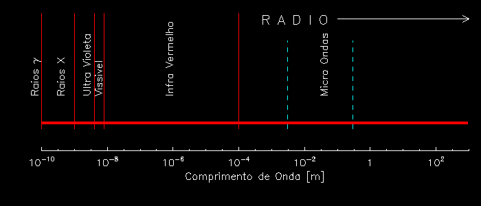 Estrelas Os elementos mais conspícuos das galáxias são as estrelas, são também elas as que marcam os caminhos da sua evolução. Portanto, devemos fazer uma pausa para conhecê-las melhor. Vamos ver primeiramente as características de sua luz. As estrelas não emitem a mesma intensidade para todas as cores. Em astrofísica falamos de comprimento de onda, representada com a letra grega lambda (λ), em vez de cor. O comprimento de onda é um conceito mais amplo do que a cor; na verdade, existem vários comprimentos de onda em que não podemos atribuir qualquer cor, porque esta última é definida pelo olho humano, que detecta apenas uma pequena gama de comprimentos de onda. A luz visível (ao olho humano) tem λ muito pequeno, entre 400 nm (ultra violeta) e 800 nm (infravermelho próximo), algumas pessoas conseguem ver mais, outras menos. A Figura abaixo é um esquema do espectro eletromagnético (luz), variando dos raios-X às ondas de rádio kilometricas. Como pode ser apreciado, a janela visível é muito pequena.